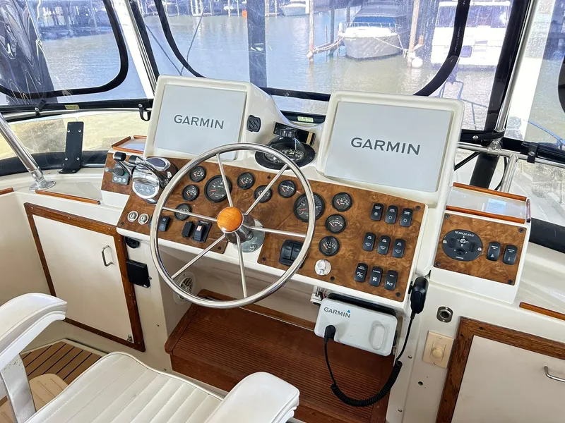 So many updates here...Major Garmin Electronics pkg and all new gauges in 2022, All the AC systems have all been replaced in the last 2 or 3 years, and new isinglass on the bridge was added in 2022. New flooring in the salon is beautifully done as well as several custom touches to cabinetry. She received a Bow Thruster in 2020 and a bottom job with prop speed in 2022. And Holy Moly was outfitted with a Reriton Electro Scan Hold-and-treat system in 2020. There are spare props included as well as several toolboxes and many spares. A modest performer with her standard 375hp Cats, she'll cruise at 15-16 knots and provide outstanding range.