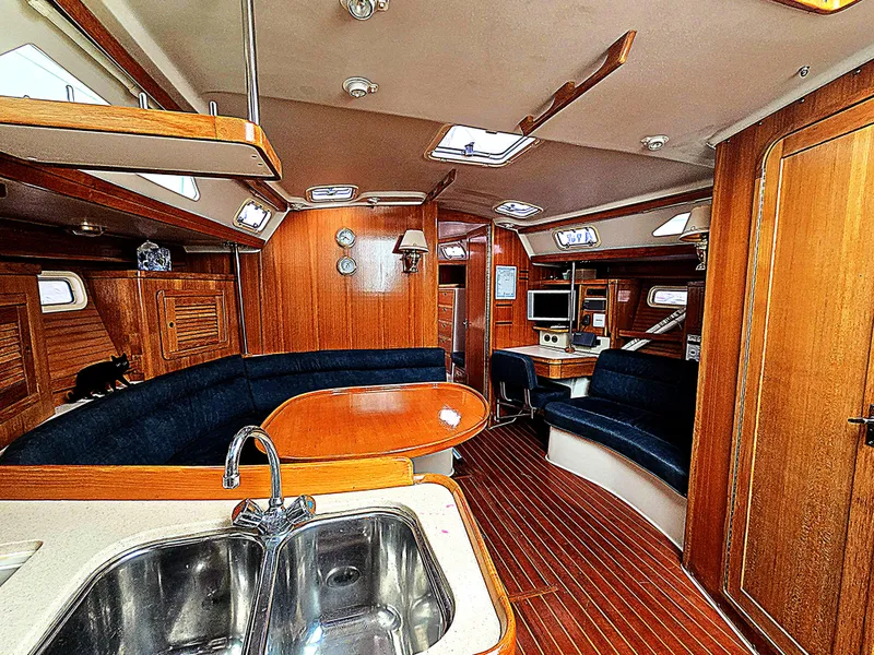 Large salon has central seating for 6 (converts to double berth). Teak shelves & cabinets outboard, varnished teak dining table flanked by a sizable settee with storage below adjoining the port chart table; walk-through galley to port with exceptional storage..