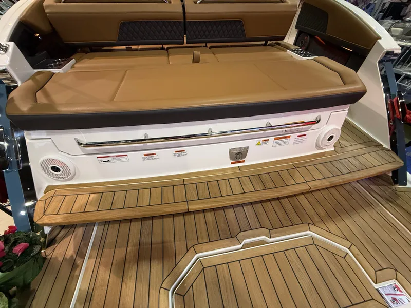Entertainment is elevated with a Harman Kardon Platinum sound system with transom speakers, RGB LED interior accent lighting, underwater lighting, and swim platform transom lights-creating the perfect atmosphere from daytime cruising to evening gatherings. Wireless phone charging, weighted throw pillows, and thoughtful storage enhance comfort throughout the boat.