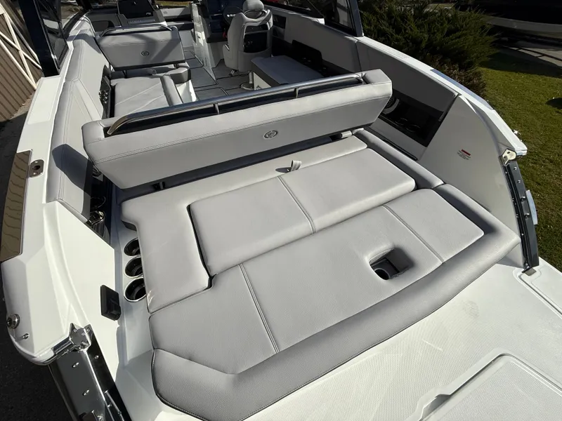 At the helm, the dual Garmin 8610 glass cockpit provides a cutting-edge command center with crystal-clear displays and intuitive controls. Keep your devices powered with the wireless phone charger, and enjoy rich audio from the Premium Sound system with transom speakers-perfect for boat days at anchor or a quiet cruise at dusk.