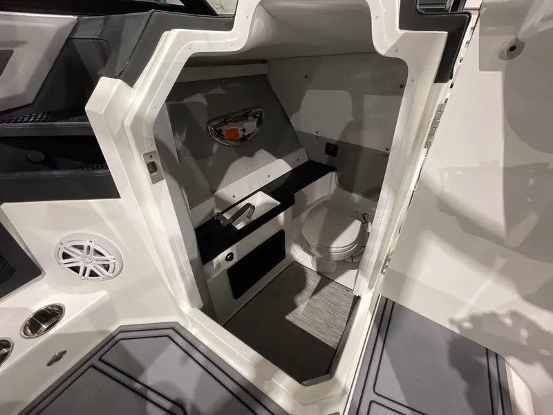 Entertainment and tech meet seamlessly with Premium Sound featuring transom speakers, a rear-facing camera for confident docking, and a wireless phone charger with holder to keep devices powered all day. The electric porcelain head with sink console and transom shower add the kind of convenience you'll appreciate after long surf sessions.