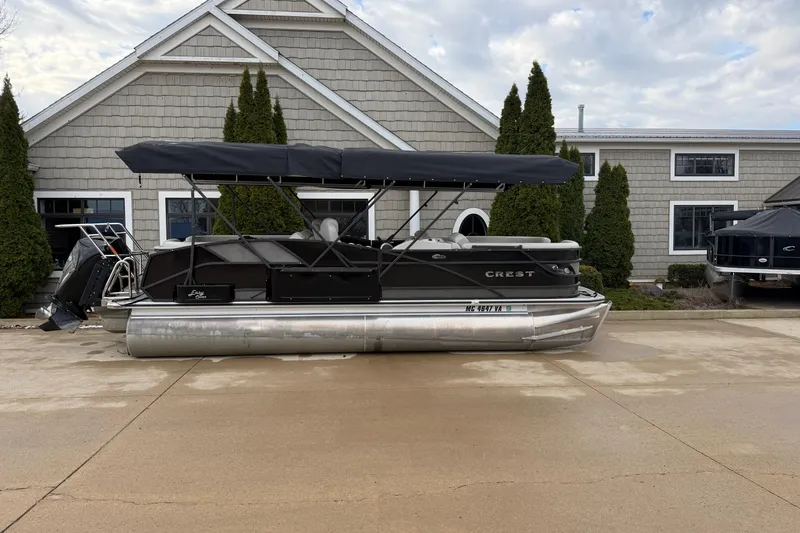 2023 Crest Caribbean 230 SC Tri Toon powered by a Mercury 200hp V6 with 33 hours. Equipped with an Easy Cover, Premium Poly Vinyl flooring, Fusion Bluetooth radio with upgraded Amplifier and Subwoofer, Simrad NSX7 touch screen GPS fish finder chart plotter, Pedestal table, fiberglass seat bases with Built in cooler tubs, Ski tow bar, Lillipad Easy step boarding ladder, mid ship flip up table.