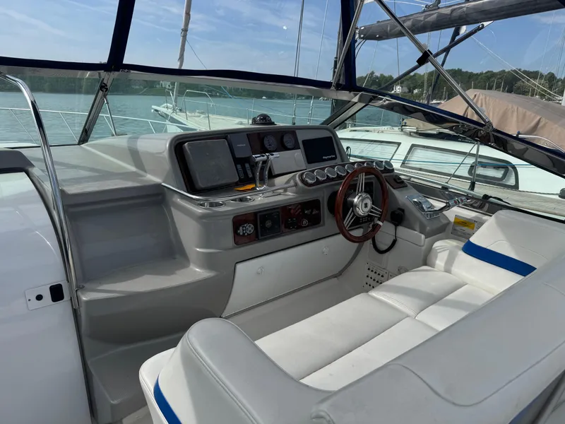 Entering the boat from the stern port side transom door is a large cockpit area with a large U-Shaped seating area with removable tables. The port side wet bar is complete with sink and icemaker. Moving forward is the port lounge seating, directly to starboard is the helm area with twin command seating. Stepping down into the salon area is the port side enclosed head with stall shower, the efficient galley area with abundant storage. Forward is the large centerline queen berth with an overhead hatch. On the starboard side is the sofa with a removable table. Also, a Midship cabin that can convert to a sleeping area.