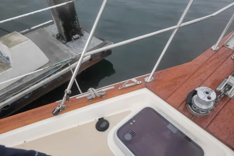 Sturdy twin stainless steel anchor cradles one of which houses a Delta II plow anchor attached to chain with seized ss shakle. The chain runs through a chain lock to the SS Muir electric windlass, all mounted on a varnished teak deck pulpit. Newly varnished Teak covers the cap rail around the entire deck.