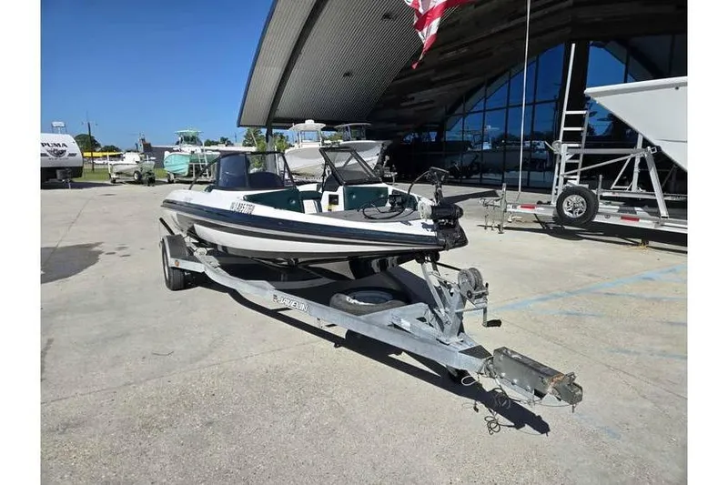 The Javelin 389 FS is a 19-foot fiberglass, outboard fishing boat with a beam of 7'5" and a net weight of about 1,590 pounds. It was a model from the mid-to-late 1990s and is part of the Javelin bass boat line, known for its racing-style appearance. This specific model was designed to be powered by a 175 horsepower outboard engine.