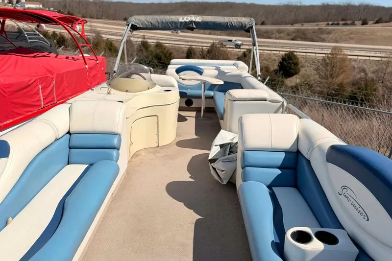 The Suncruiser Jamaica 250 features a custom fiberglass helm station complete with gold bezel gauges, wood grain tilt wheel, and a unique double helm seat with a pivot slider. To entertain in style, Lowe has provided a marine AM/FM CD stereo including four high power coaxial speakers. This pontoon boat also includes a color coordinated Bimini top with improved headroom and boot. And with four colors and exclusive custom weave carpet available, the 250 can suit any taste. Standard features on the Jamaica series include from top to bottom: a roomy pop-up privacy enclosure, which folds down into an oversized sundeck pad; a fiberglass console with speedometer, voltmeter, tachometer, trim and tilt and depth gauges; under-console courtesy lighting; and plush wrap-around seating so that family and friends can cruise in high style.