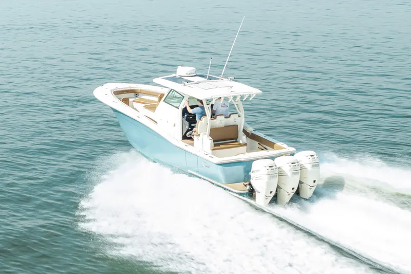 Our 355 LXF showcases unmatched performance with our Scout Dual Stepped Hull Technology, and utilization of Epoxy-Infusion for unmatched strength and stability. But high performance is just one attribute of this incredible model. The deck was designed to accommodate an optional Seakeeper 3DC gyro stabilizer just under the aft-facing bench seat, and for protection from the elements, just engage the optional electric fiberglass cockpit Sun Shade. Other notable innovations on this model include standard independent heated seats at the helm, a standard integrated forward-facing fish eye bow camera allowing you to see what's going on in front of you via the helm touch screen displays, and solar panels that provide a trickle charge to AGM batteries when the Seakeeper 3DC is ordered for a longer battery life. And that's just above deck. Just wait until you step down into the cabin and find all the luxurious appointments, headroom and attention to detail this beauty provides.