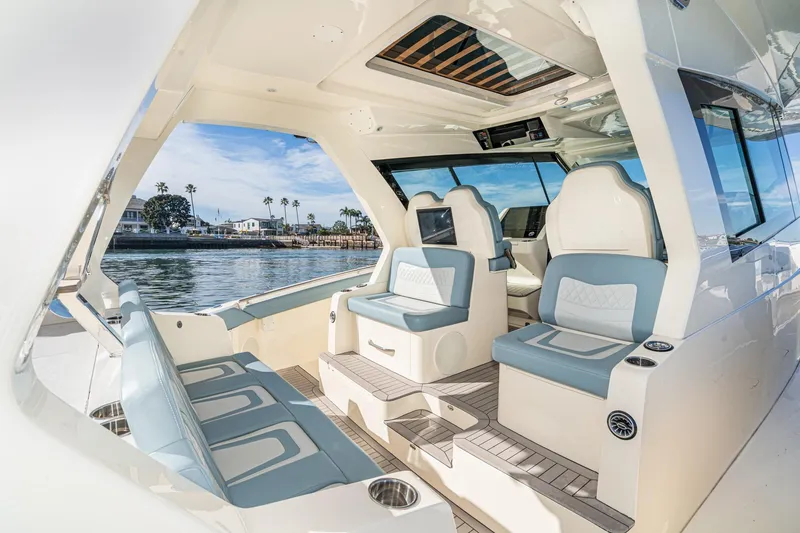 - Seating for 6: Port Lounge, Forward Port and Starboard Lounges, Captain’s Seating at Helm