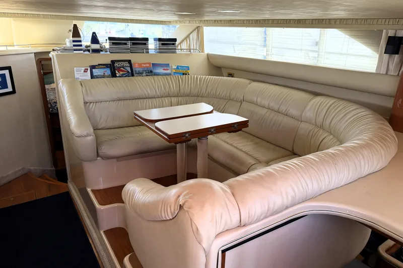 "A Sea D Sea" is a well-maintained example that has recently benefited from a series of significant mechanical and comfort upgrades, making her an excellent option for buyers seeking a turnkey cruising yacht. Recent improvements include a complete engine cooling system overhaul, three new air-conditioning units, new flybridge canvas and eisenglass enclosure, and the addition of a Dockmate wireless remote control system, allowing the operator to maneuver the vessel while docking from anywhere on deck.