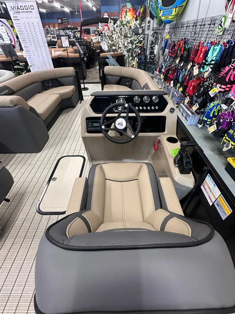 2026 Viaggio LAGO V22S TRITOON, The 2026 Viaggio Lago V22S Tritoon blends modern styling, upgraded comfort, and proven Viaggio performance-now available at Fay's Marina in La Porte, Indiana 46350. Powered by the reliable Honda BF150 HP outboard and built on Viaggio's 22' Tripletoon Performance Package, this V22S delivers excellent lift, handling, and efficiency on the water. This model comes equipped with premium factory upgrades and the full suite of Lago V-Series Standard Features, making it one of the best-value tritoons in its class. Installed Upgrades Honda Pre-Rig 22' Tripletoon Performance Package (25" logs, lifting strakes, performance shield) SeaStar Hydraulic Steering Wireless Charging in Helm Power Bimini with Speed Straps Lakeport Plank or Anthracite-Style Vinyl Flooring (V-Series standard flooring options) Tube Protectant & Pontoon Side Keel (Port & Starboard) Center Toon In-Floor Storage (available with Tripletoon package) LED Interior Lighting Package Ski Tow Bar (Extreme or Standard depending on final build) Lago V-Series Standard Features (2026 V-Series standards sourced from Viaggio Pontoons) Exterior & Structure 2' Extended Swim Deck 0.100 Gauge Metal on Tubes Black Anodized Rails Black Anodized Deck Trim & Side Skirting 2" Extrusion Rail Design Integrated Corner Cap Navigation Lights Stainless Steel Cleats Extended Splash Deflectors on Nose Cones Rail Caps Around All Door Openings Luxury Woven Vinyl Flooring Fuel Capacity Bi-Toon: 26 gallons Tripletoon: 58 gallons (same tank used across V/X/Z 22-24' platforms) Helm & Technology Acrylic or Fiberglass-Style Dash with Backlit Push Buttons Automotive-Style Instrument Panel 5" Viaggio Digital Gauges (GPS Speed, Tach, Fuel, Trim, LED Display) Glass Windscreen Gussi Italia Molino Steering Wheel Master Power Switch Wireless Charging Pad (upgrade installed) Audio & Lighting Clarion Audio System with Monochrome Display (V-Series standard) Four 6.5" Speakers LED Interior Lighting (Cupholders, Seat Bases, Helm Area) Comfort & Interior Mid-Back Captain's Chair with Swivel Integrated Cupholders & Speakers in Bench Seating Premium High-Density Foam Furniture Round Table Kit with Removable Table Post Premium Black Canvas Crib Cover with In-Rail Clip System Vented Pole Holders & Extendable Aluminum Poles Battery & Electrical EGIS ACR Battery Management System (V-Series standard) Performance Highlights Honda BF150 HP - reliable, quiet, fuel-efficient 22' Tripletoon Performance Package Lifting Strakes for improved acceleration & cornering Performance Shield for reduced drag SeaStar Hydraulic Steering for smooth control Why Buy from Fay's Marina? Fay's Marina has served Northern Indiana and Southwest Michigan for decades, offering trusted service, certified rigging, and a full lineup of pontoons, tritoons, and marine accessories. Every Viaggio is delivered water-ready, professionally rigged, and backed by a knowledgeable team committed to customer satisfaction. Location: Fay's Marina, La Porte, Indiana 46350